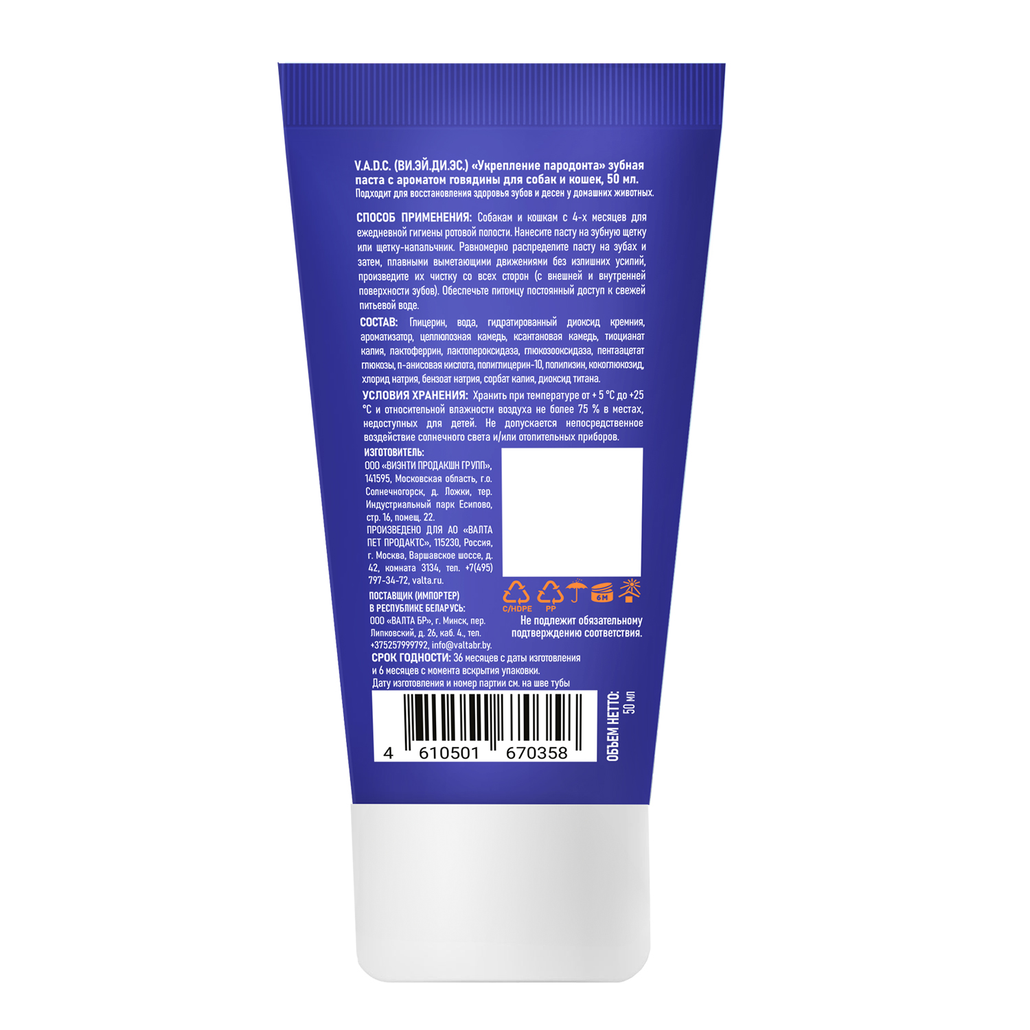 Формулы зубных паст V.A.D.C. разработаны в России совместно с Иваном Николаевичем Макаровым — главным врачом ветеринарной клиники «Джунгли», кандидатом ветеринарных наук и членом European Veterinary Dental Society. Продукция производится на передовом предприятии по разработке инновационной косметики в России, что гарантирует высокое качество и соответствие современным научным стандартам.